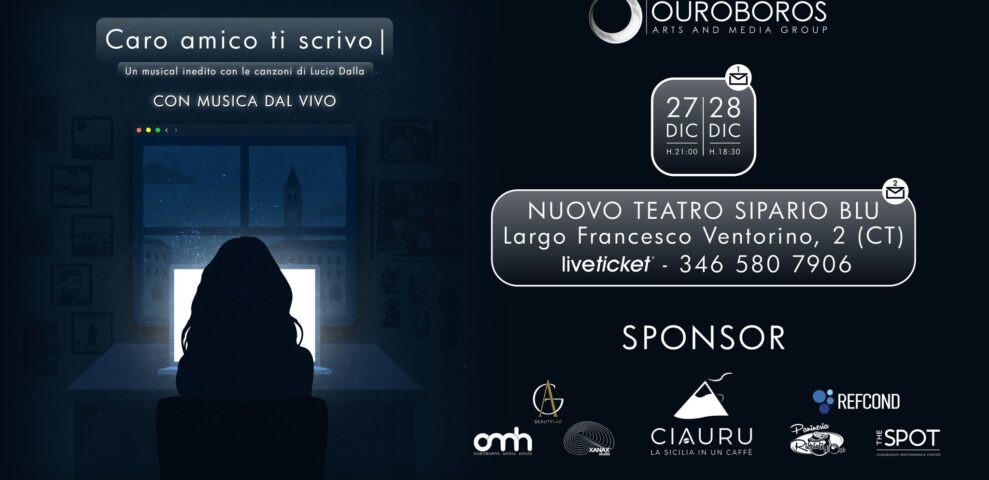 CATANIA – Le canzoni di Lucio Dalla diventano racconto, emozione condivisa, teatro musicale. Si intitola “Caro amico ti scrivo” il nuovo musical inedito – in live concert – prodotto da Ouroboros Arts and Media Group, in scena al Teatro Nuovo Sipario Blu di Catania il 27 dicembre 2025 alle ore 21:00 e il 28 dicembre 2025 alle ore 18:30. Le prevendite sono già disponibili su Liveticket.it.